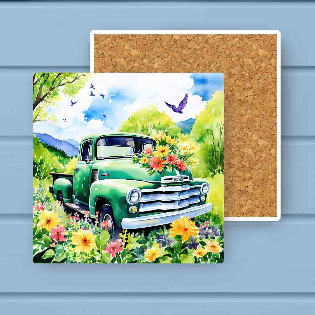 Vintage Spring Green Farm Truck Flowers Stone Coaster