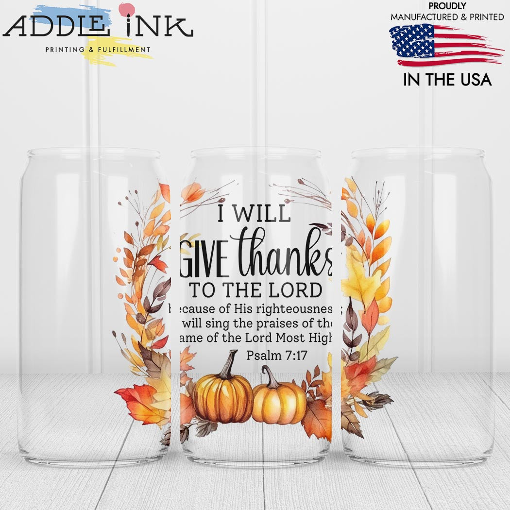 I Will Give Thanks to the LORD Fall Pumpkin Can Glass