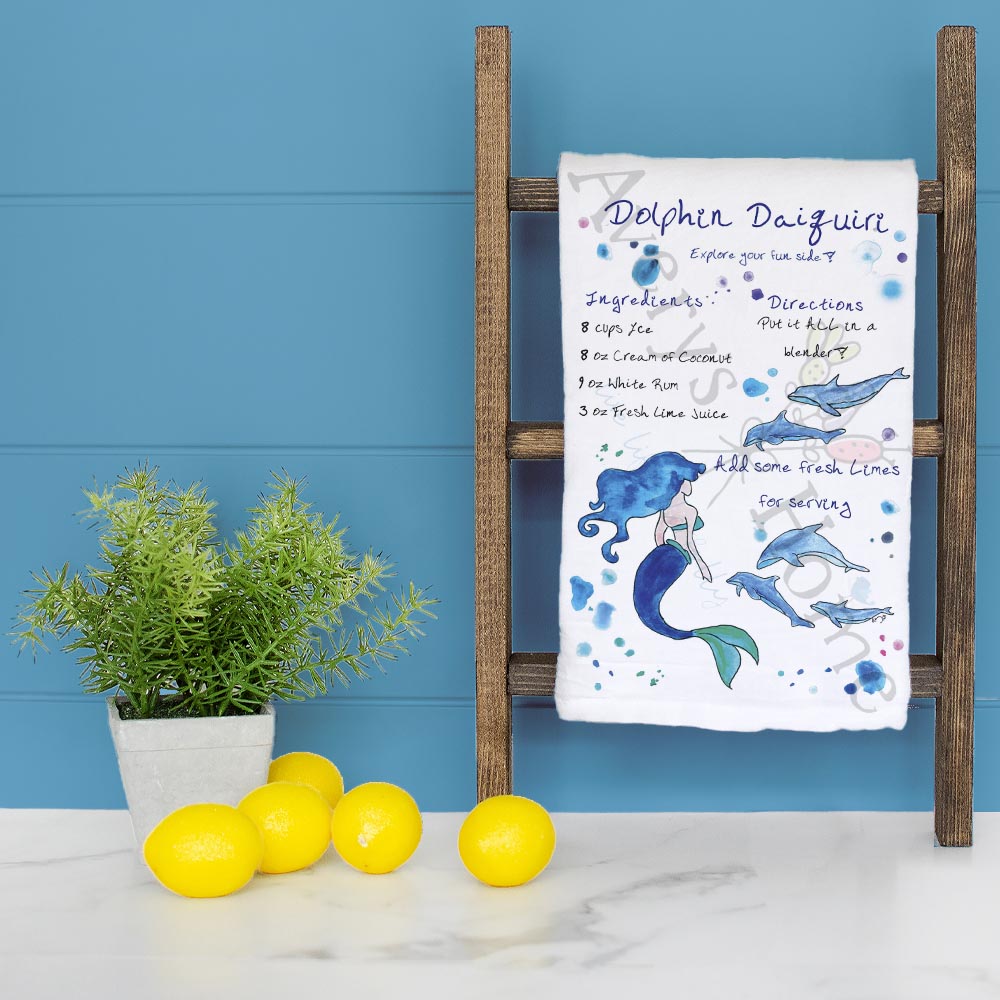 dolphin daiquiri towel, beach cocktail decor, fruity drink recipe tea towel, flour sack dish towel, hand towel, seaside kitchen gift