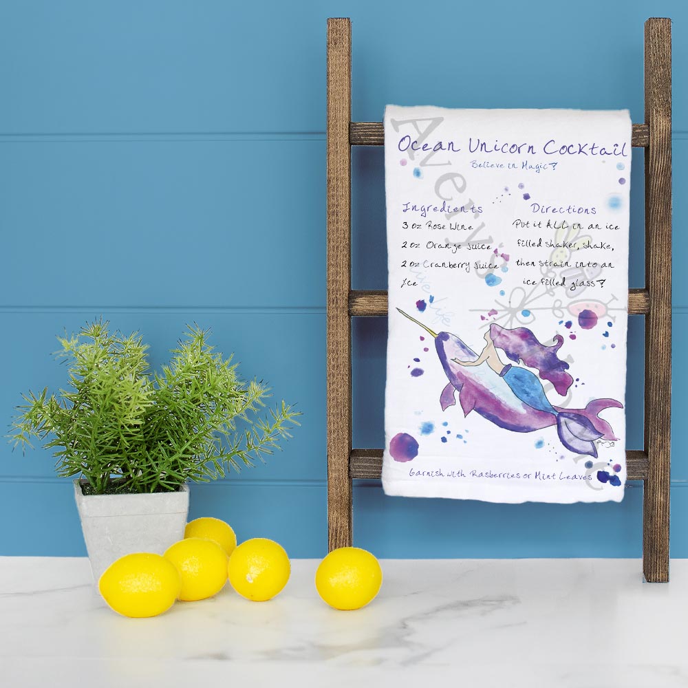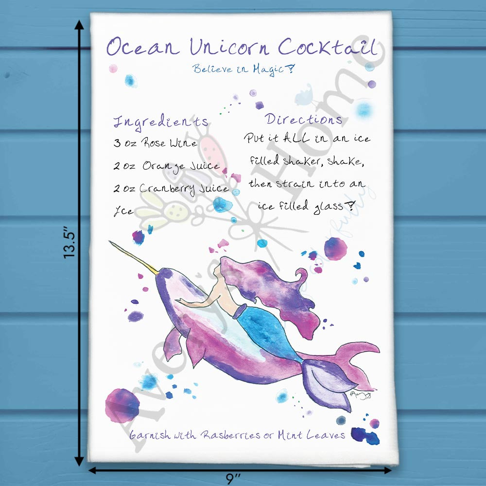 ocean unicorn cocktail towel, beach bar recipe decor, fruity drink tea towel, flour sack dish towel, hand towel, mermaid party gift