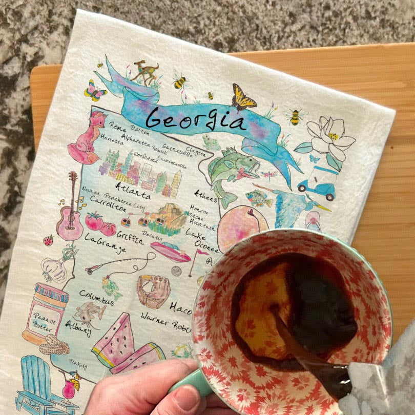 From sweet peaches to Southern charm, this Georgia towel celebrates local flavor and illustrated elegance. A must-have for proud Georgians, porch sippers, or thoughtful Southern host gifts.