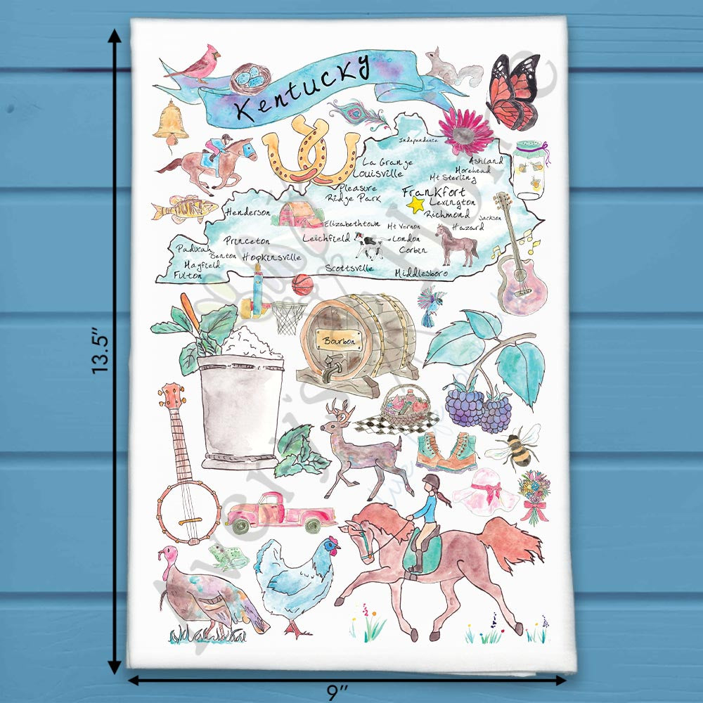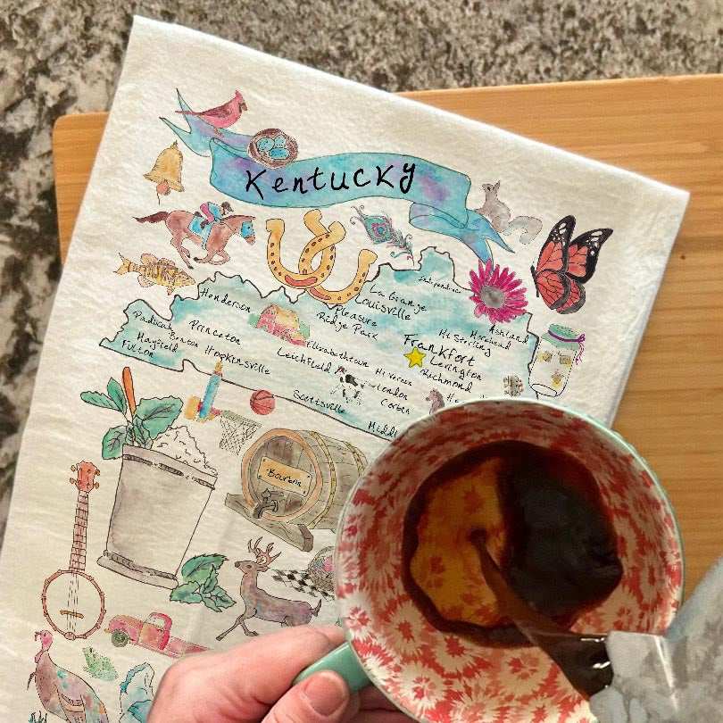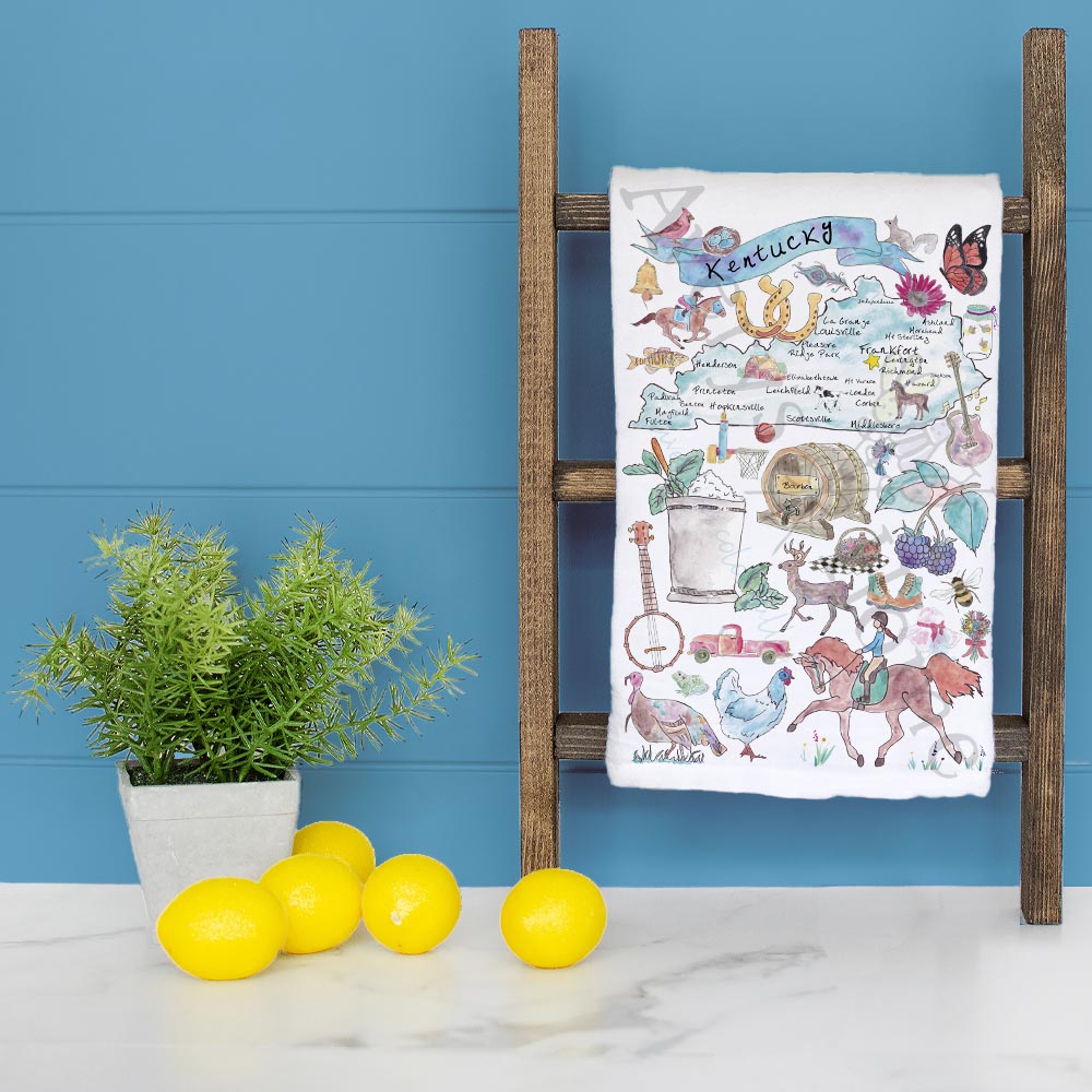 From winding horse trails to barrels of bourbon, this Kentucky towel highlights everything that makes the Bluegrass State unforgettable. Ideal for Derby hosts, bourbon lovers, and kitchens that echo with Southern charm.