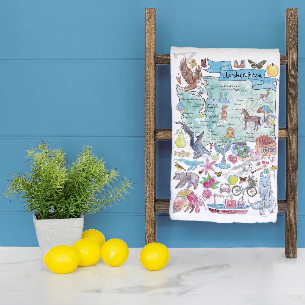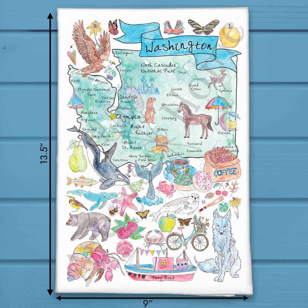 Misty mountains, ferry crossings, and forest greens—this towel wraps up Washington in rain-washed beauty. Great for Seattle kitchens, island escapes, or lovers of Pacific Northwest vibes.