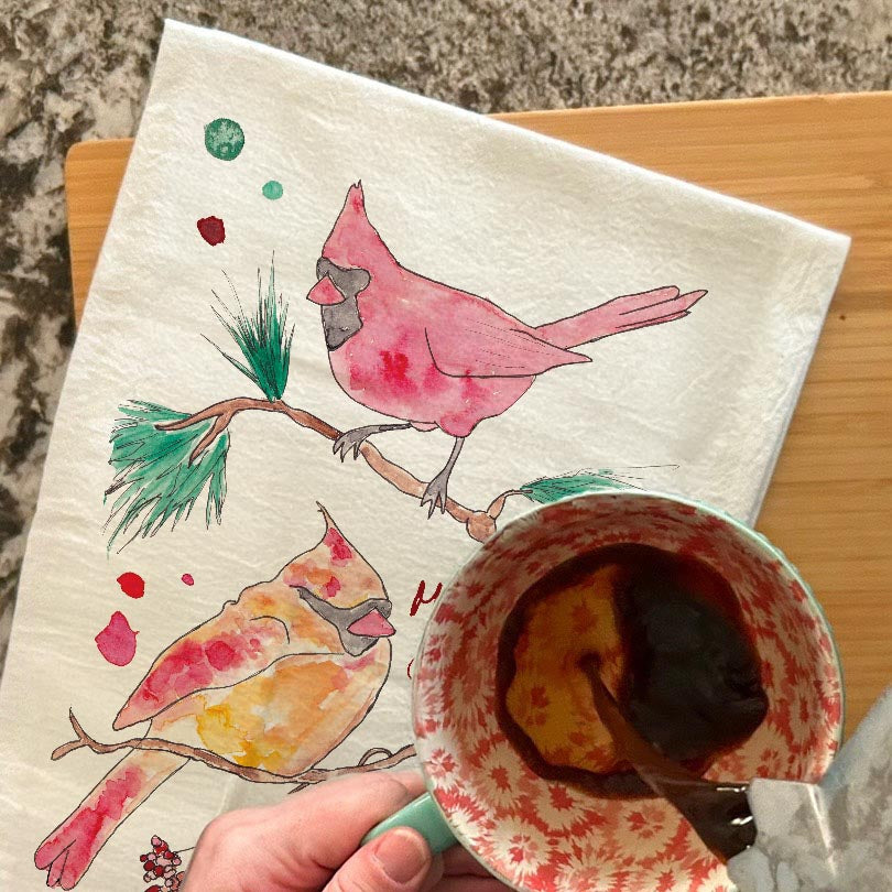 A bright red cardinal in a snowy scene brings timeless comfort and joy to your holiday kitchen. This towel is a lovely tribute to memory, nature, and the warmth of those we hold dear.