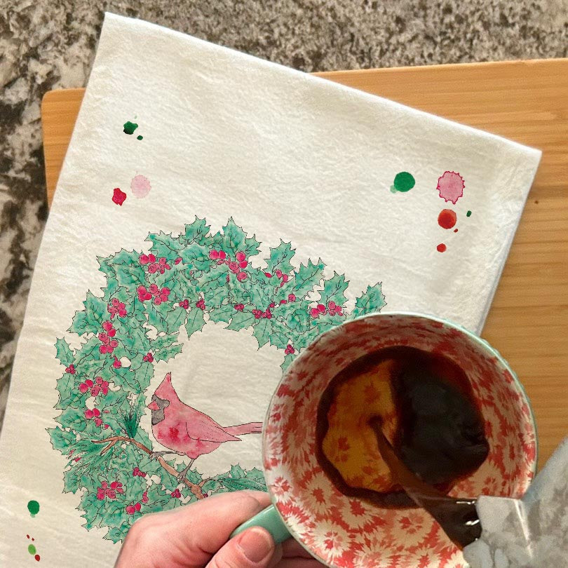 Cardinal Christmas Wreath Tea Towel – Classic Seasonal Symbol