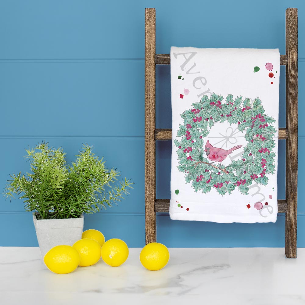 cardinal wreath towel, traditional christmas decor, holiday bird tea towel, flour sack dish towel, hand towel, classic winter gift
