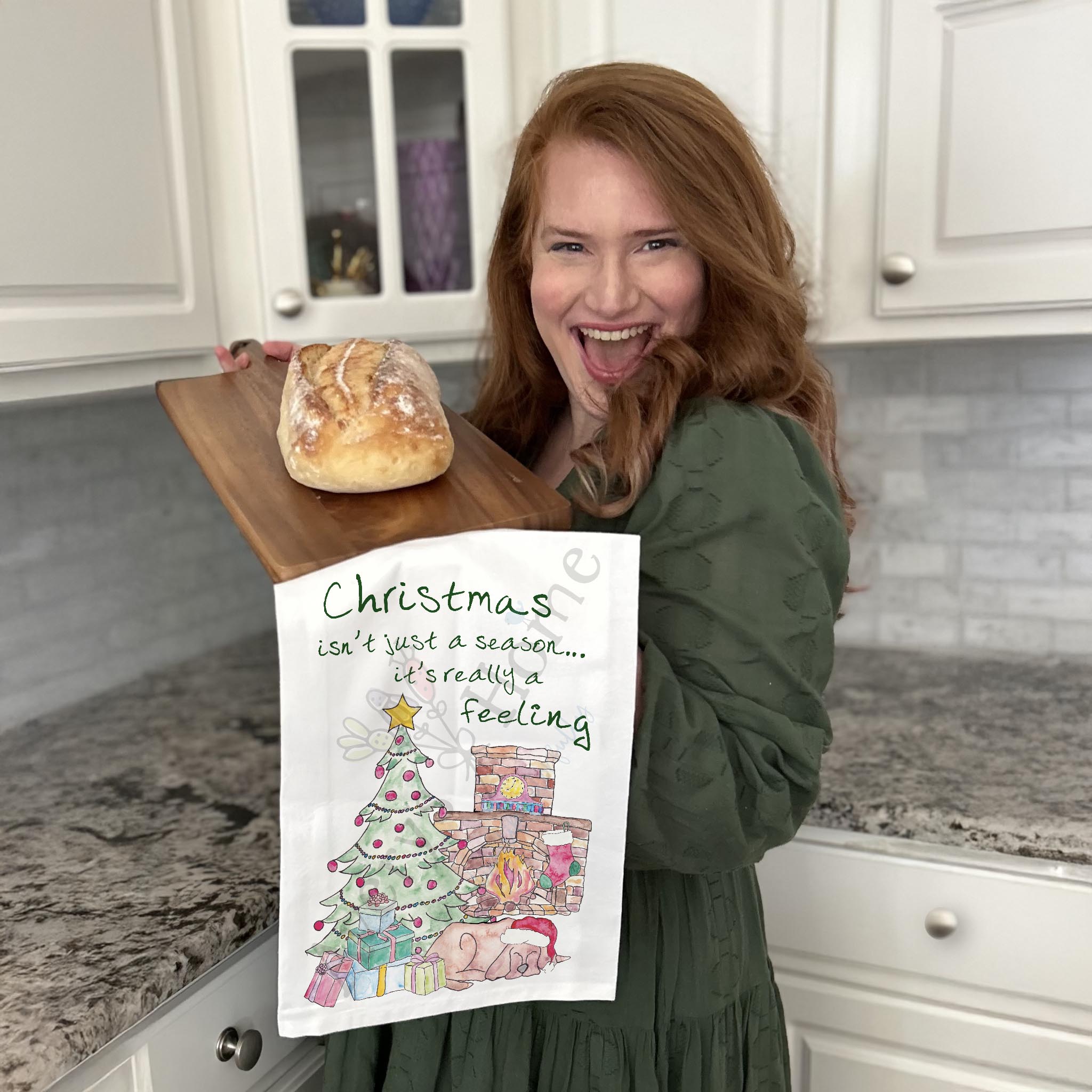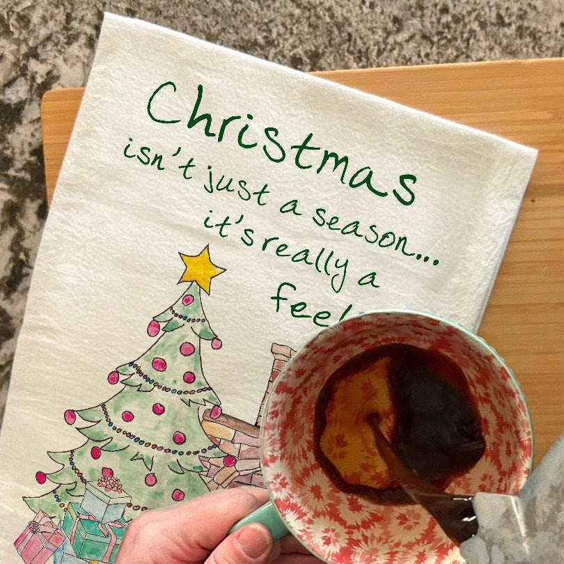 christmas is a feeling towel, holiday sentiment decor, cozy winter tea towel, flour sack dish towel, hand towel, heartfelt christmas gift