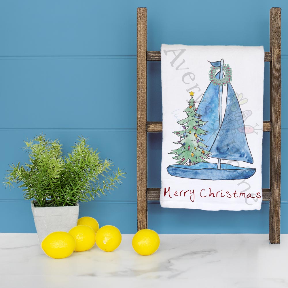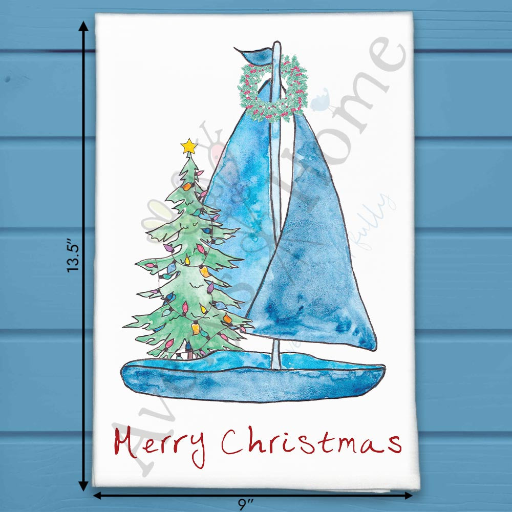 sailboat christmas towel, nautical holiday decor, coastal christmas tree tea towel, flour sack dish towel, hand towel, ocean christmas gift