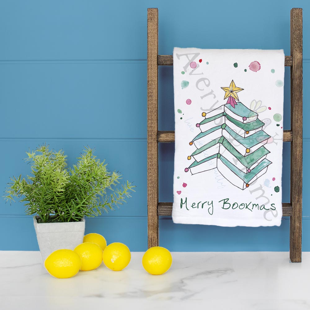 book tree christmas towel, literary holiday decor, cozy reader tea towel, flour sack dish towel, hand towel, booklover gift