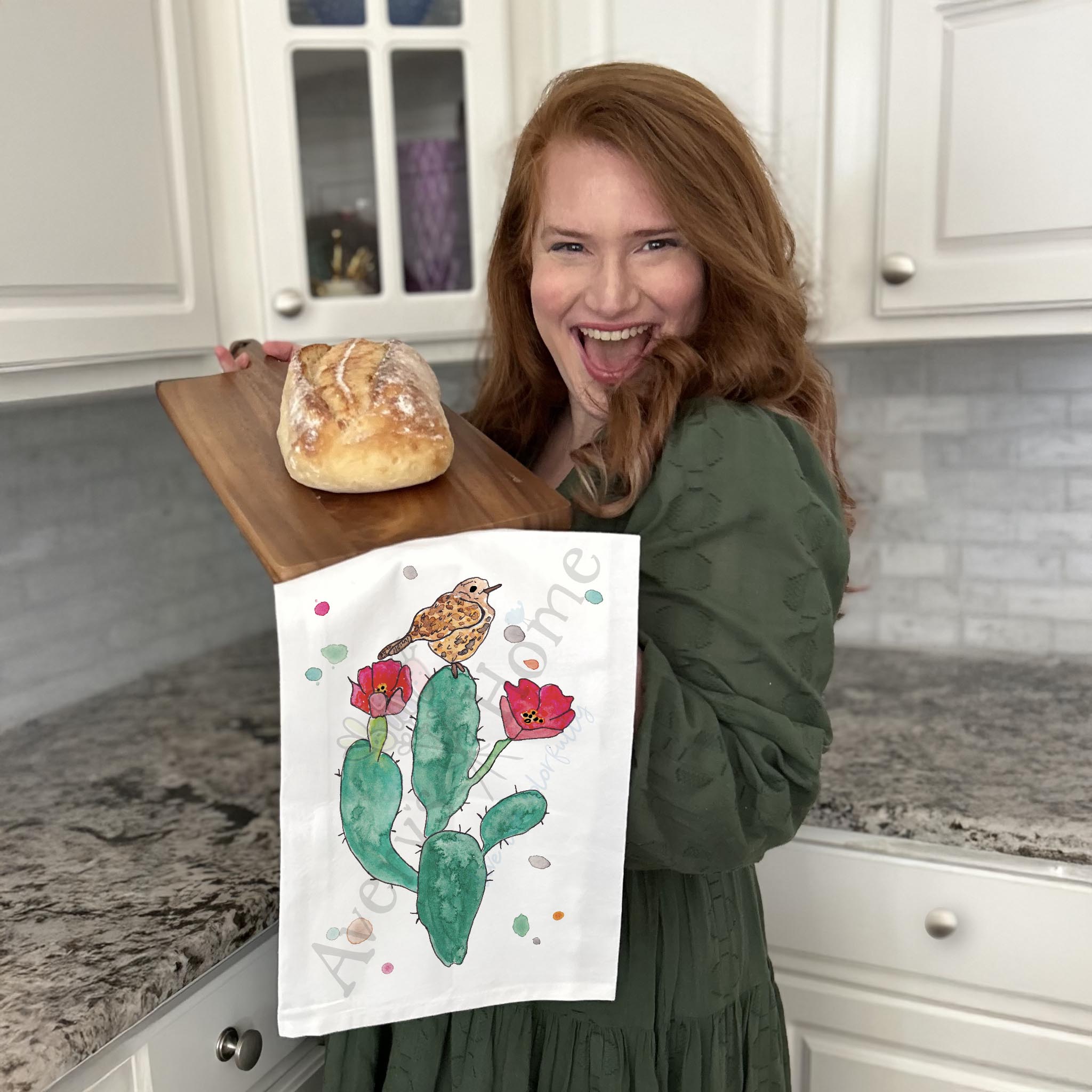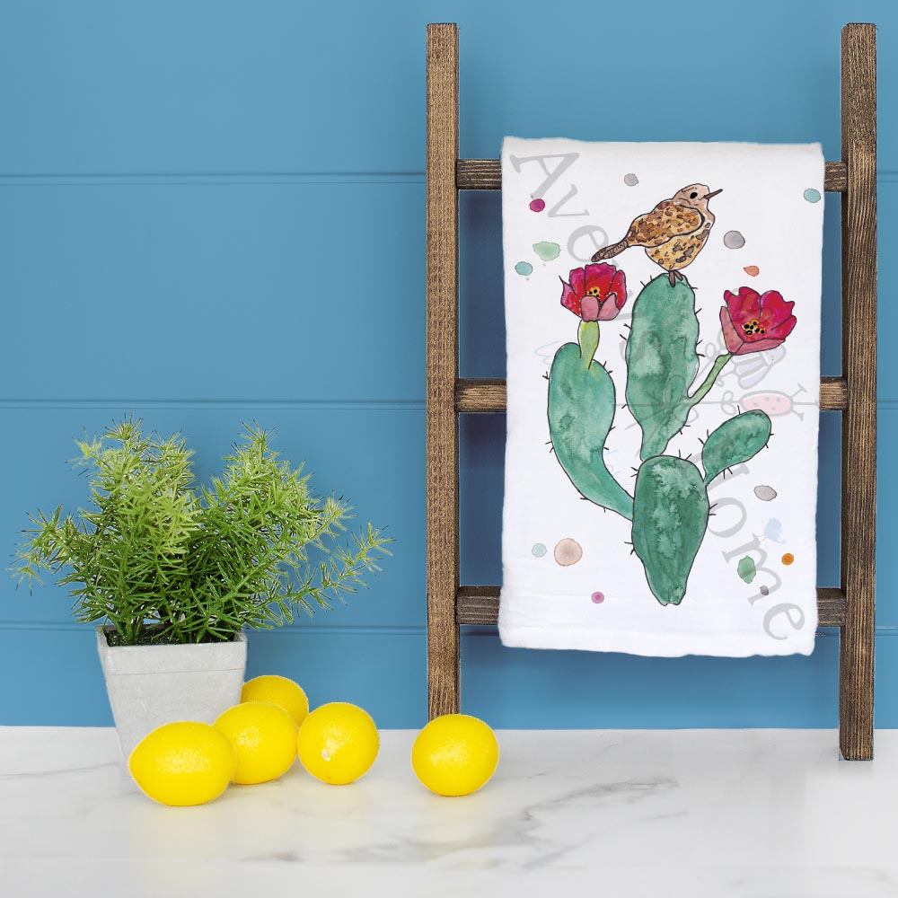 cactus bloom towel, desert decor kitchen, floral southwest tea towel, flour sack dish towel, hand towel, boho botanical gift