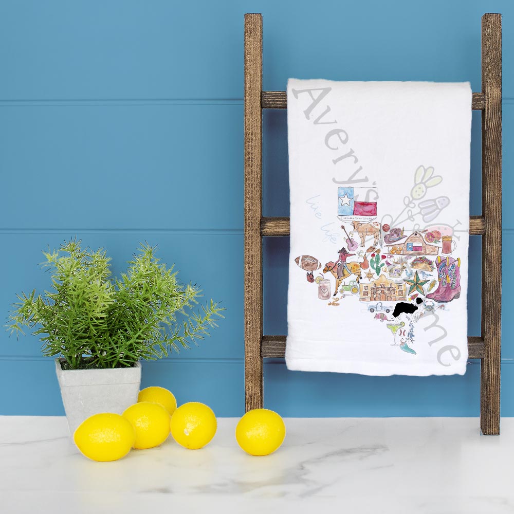 Everything’s bigger in Texas—including the heart behind this towel. Illustrated with Lone Star icons from boots to bluebonnets, it’s a true tribute to the spirit of the state.