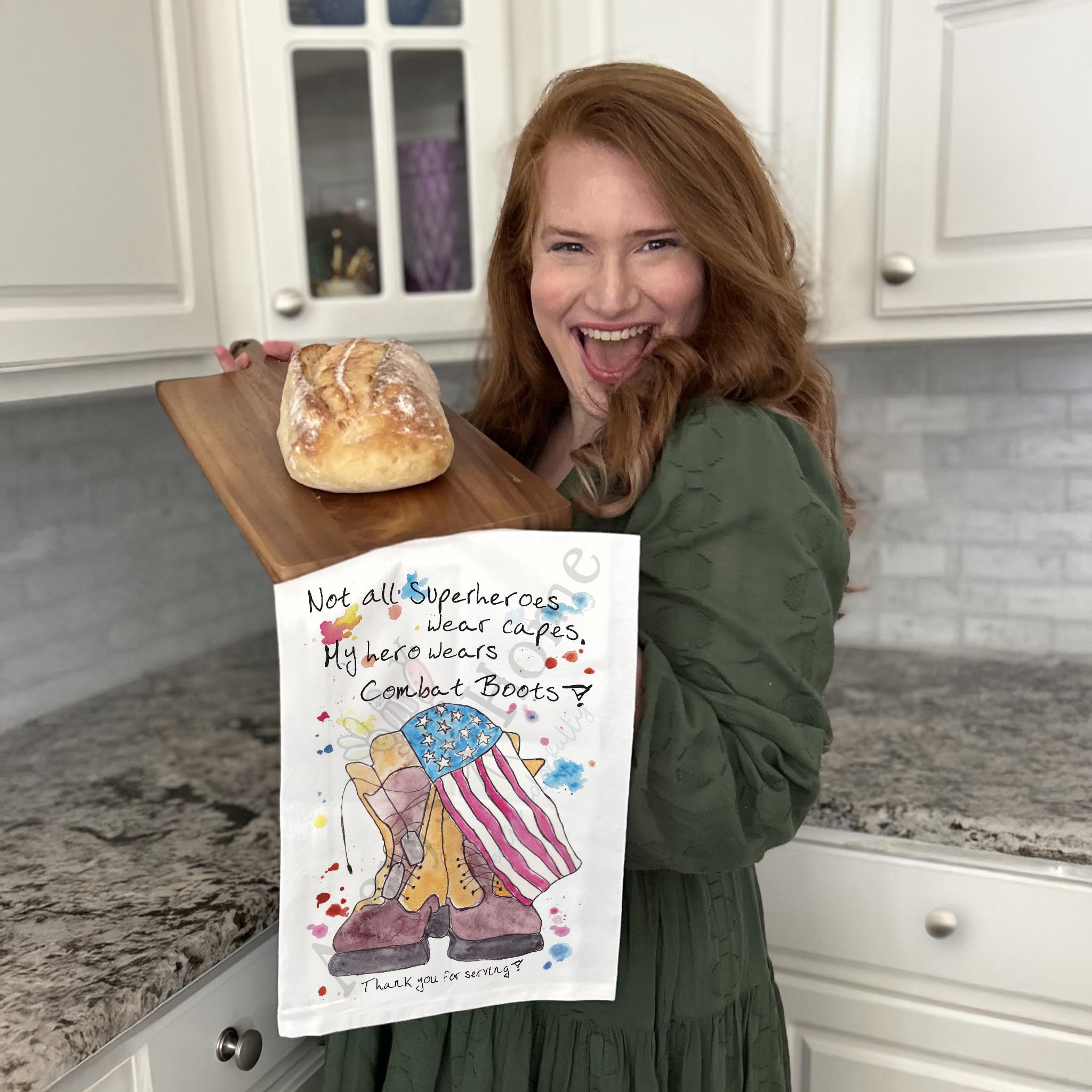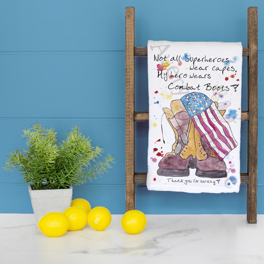 military hero towel, combat boots decor, patriotic kitchen tea towel, flour sack dish towel, hand towel, veteran appreciation gift