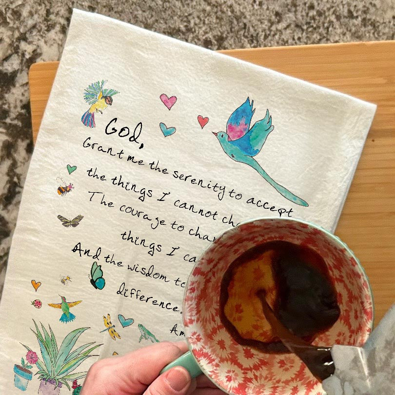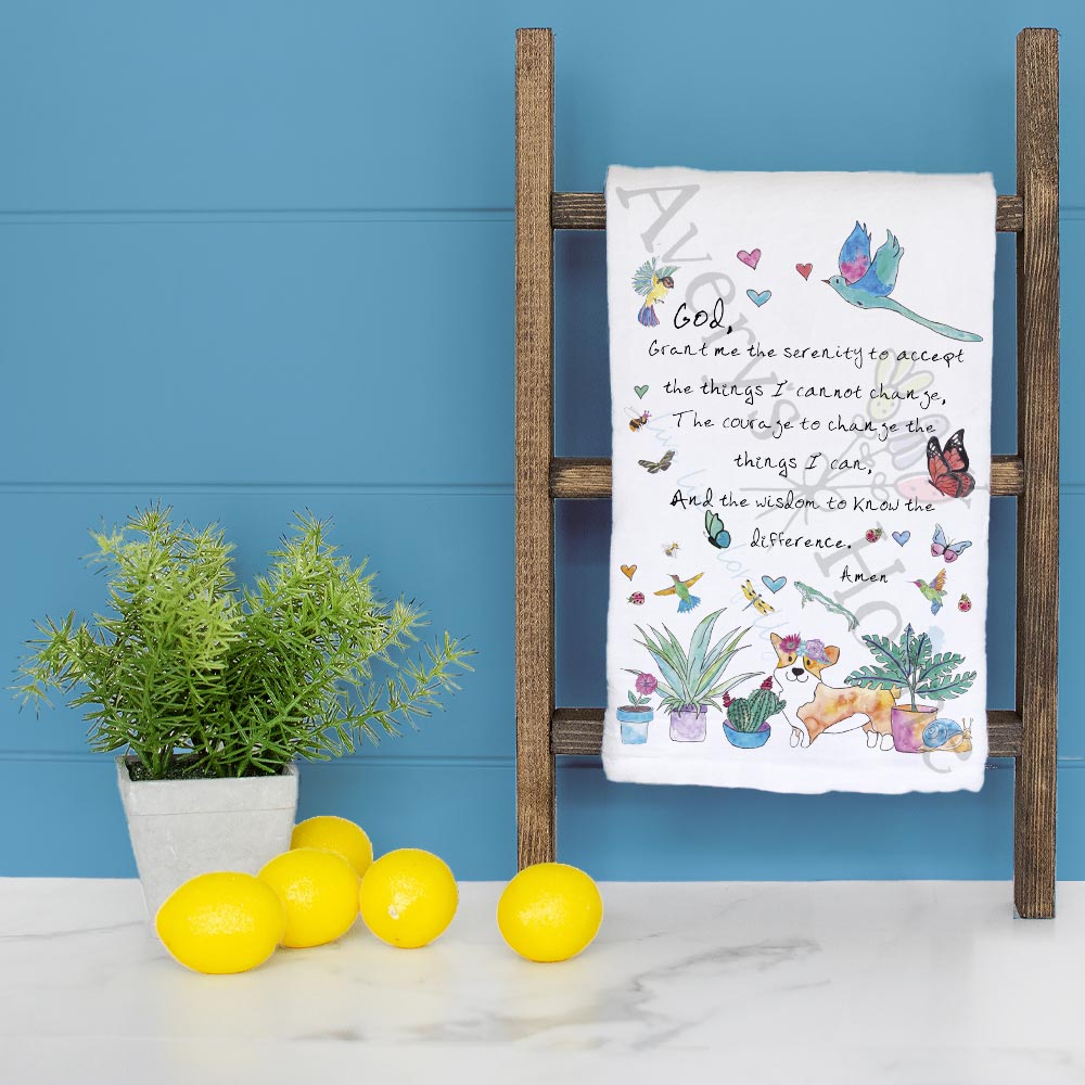 "God grant me the serenity..." A comforting classic, this towel brings calm to the kitchen with a timeless prayer and soft design. A thoughtful gift for encouragement, reflection, or spiritual homes.