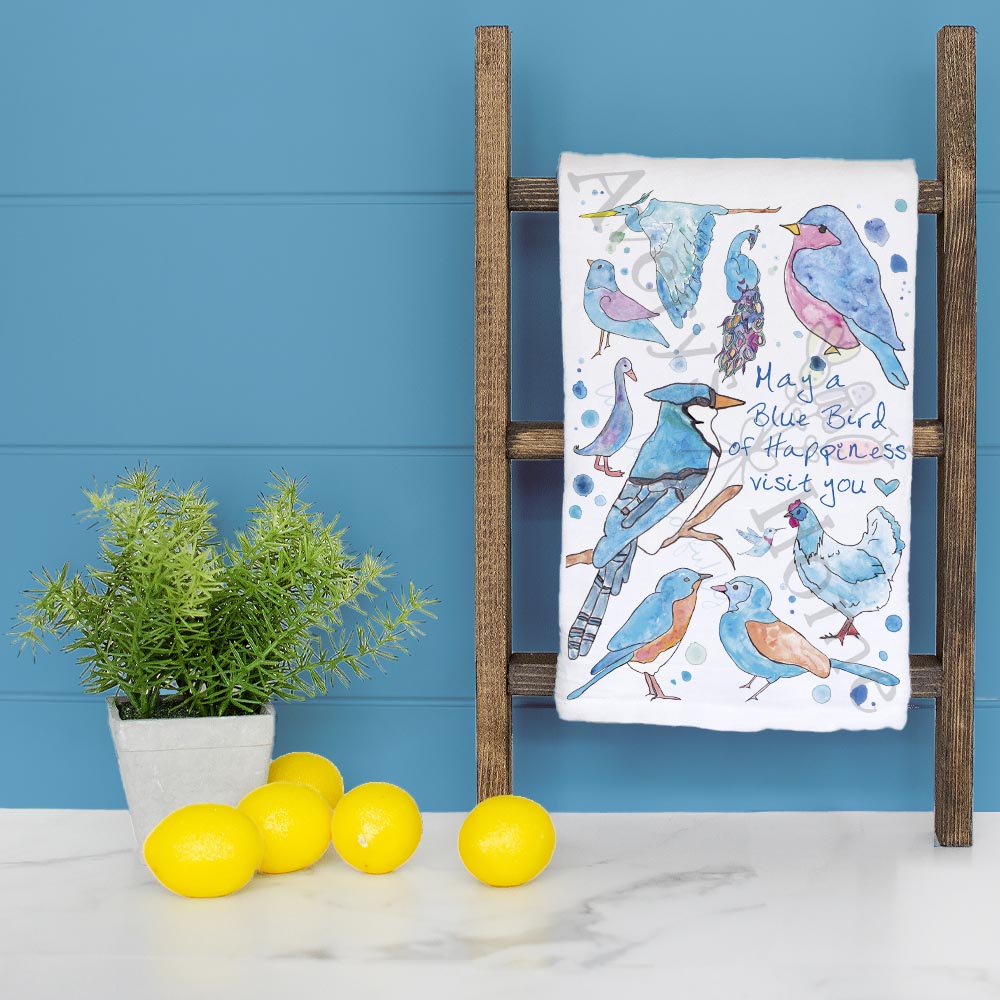 bluebird towel, happiness and peace decor, uplifting kitchen gift, flour sack dish towel, hand towel, spring bird tea towel