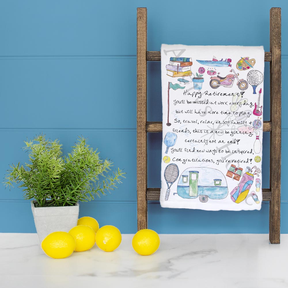 happy retirement towel, funny retiree gift, hammock life tea towel, flour sack dish towel, hand towel, farewell kitchen decor