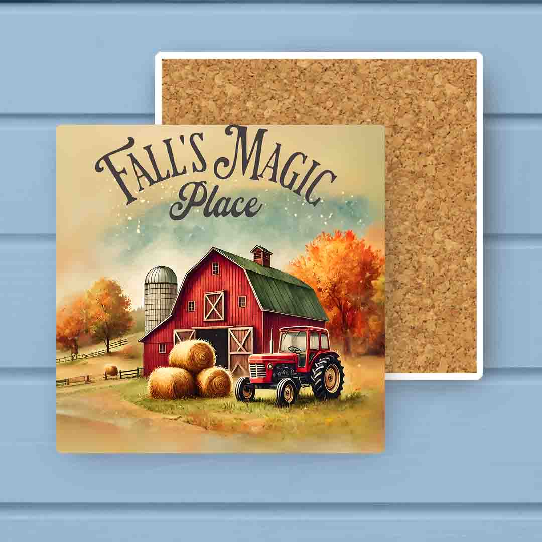 Fall's Magic Place Hay Barn Tractor Absorbant Stone Coaster