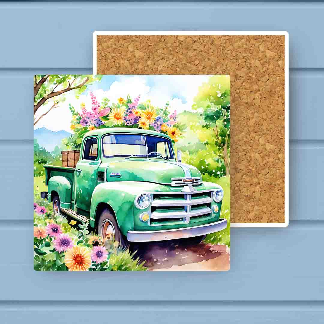 Vintage Spring Green Barn Truck Floral Stone Coaster
