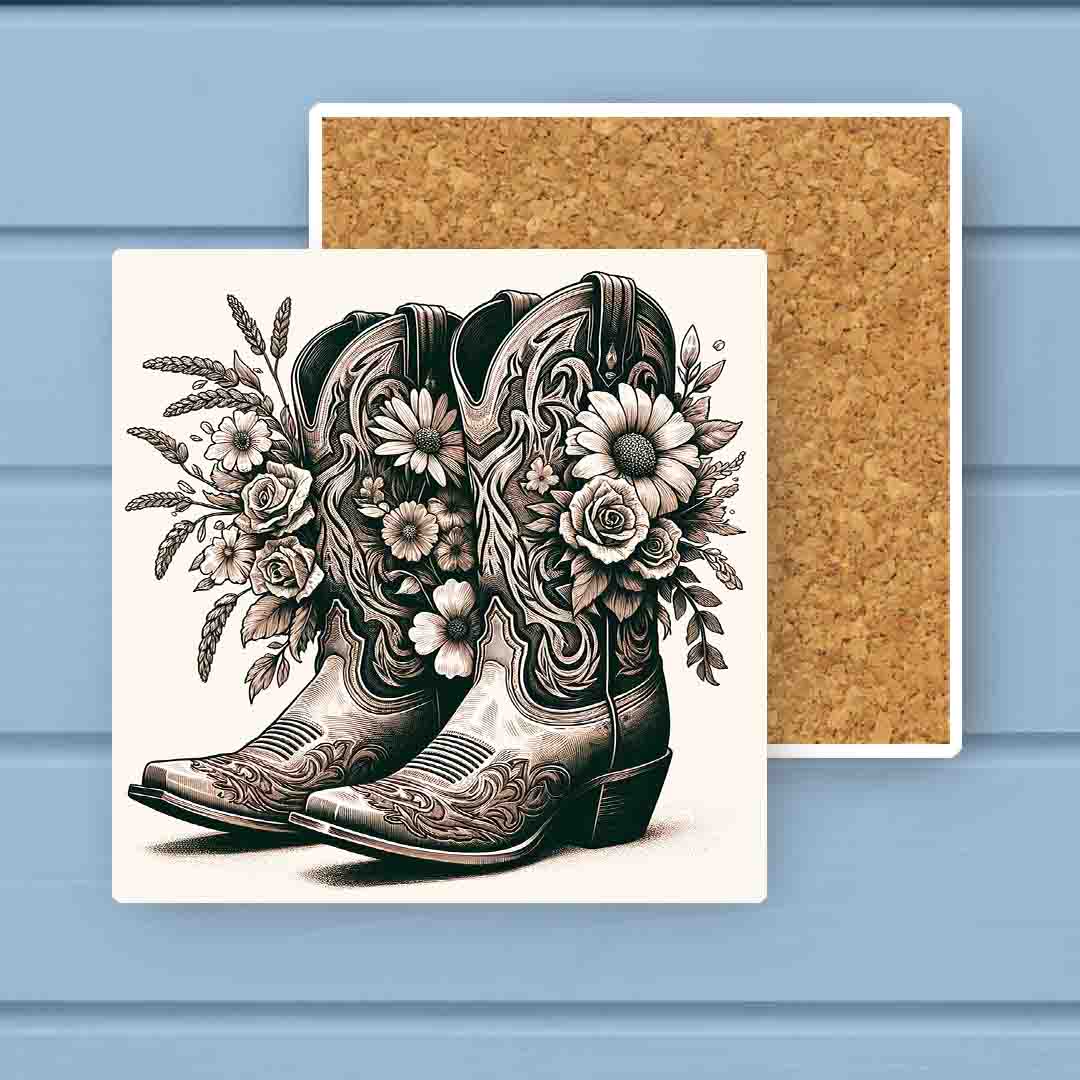 Western Sepia Floral Cowgirl Boots Absorbant Stone Coaster