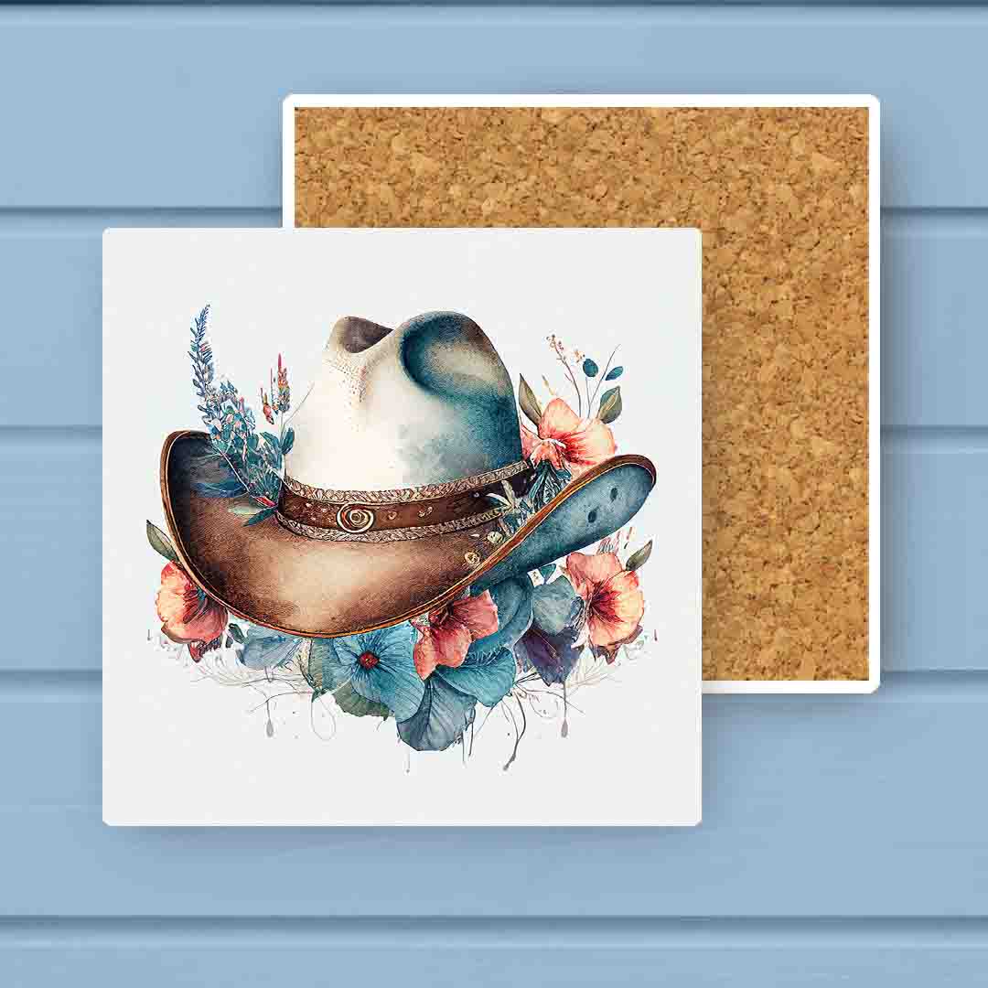 Floral Blue Western Cowboy Hat Absorbant Stone Coaster