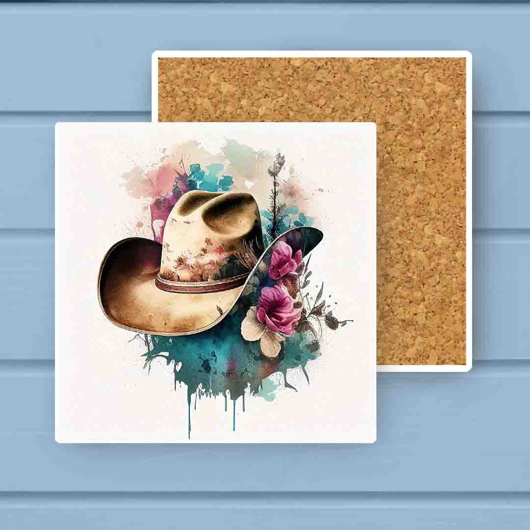 Blue Watercolor Western Cowgirl Hat Absorbant Stone Coaster