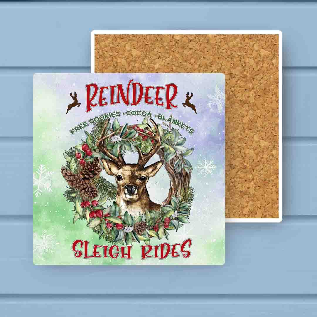 Reindeer Sleigh Rides Wreath Christmas Stone Coaster